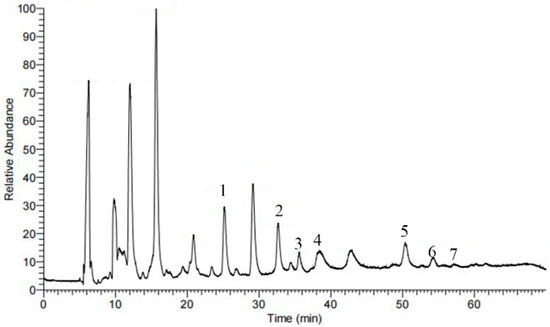 To find the presence of barrigenol-like triterpenoid saponins that were recovered from the TPMBr-La extracts, we performed an HPLC-ESI-MS analysis in the positive ion mode to identify the chemical compositions. The total ion chromatogram (TIC) of the saponins is shown in Figure 6. Seven types of triterpenoid saponins were identified, and their chemical structures are presented in Figure 7.