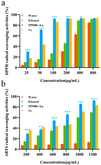As shown in Figure 8, the DPPH and ABTS free radical scavenging activity of TPMBr-La extracts displayed dose-dependence. When the concentration of the TPMBr-La extract was in the range of 25~100 μg/mL, the DPPH scavenging ability enhanced with the increasing concentration. When the concentration of the extract was 100~800 μg/mL, its scavenging ability no longer improved and tended to remain stable. The DPPH free-radical scavenging activity of the TPMBr-La extracts at 100 μg/mL exhibited the highest DPPH inhibition (92.30 ± 1.10%), significantly higher than that of ethanol extraction (26.74 ± 1.00%). As can be seen from Table 5, the TPMBr-La extracts gave the lowest DPPH inhibition IC50 value of 36.54 ± 0.46 μg/mL (p < 0.001) compared to the ethanol extracts, which had the IC50 value of 215.35 ± 6.90 μg/mL (p < 0.05), while Vc demonstrated an intermediate DPPH inhibition with the IC50 value of 59.43 ± 0.53 μg/mL (p < 0.001). The ABTS free-radical scavenging rate of the TPMBr-La extracts (92.20 ± 0.30%) at 1200 μg/mL was significantly higher than that of ethanol extracts (69.89 ± 0.07%). ABTS inhibition IC50 value of the TPMBr-La extracts was 541.13 ± 0.03 μg/mL (p < 0.001), which was lower than the IC50 value of the ethanol extracts 855.25 ± 1.66 μg/mL (p < 0.001). In sum, the TPMBr-La extracts exhibited superior antioxidant activity, which may be due to the high content of saponins in the DESs solvent-extraction and the improved bioavailability through enhanced antioxidant membrane transport [42].