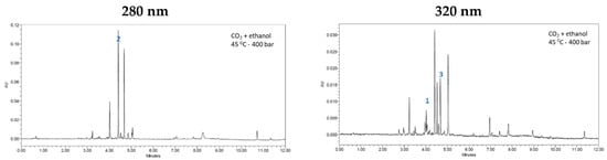 Figure 5 shows the chromatograms of the extract obtained at 400 bar and 45 °C before any fractionation as well as the fractions F0 and FIII obtained by sequential fractionation. The chromatograms have been measured at either 280 or 320 nm, according to each compound’s maximum absorption region. Three peaks have been identified: (1) Luteolin-7-glucoside; (2) Naringin and (3) Hesperidin. Regarding naringin, a comparison of the chromatograms obtained at 280 nm allow to confirm that the concentration of this compound in the extract obtained without fractionation is slightly lower (27.46 ± 1.64%) than that registered by FIII (29.18 ± 1.70%), which indicates a certain level of purification. The F0 fraction, which was extracted using pure CO2, presents very low percentages of this naringin (1.77 ± 0.24%). On the other hand, the percentage of luteolin-7-glucoside is significantly low in FIII, since most of it remains in the F0 fraction, which allows us to infer that the fractionating conditions used are selective to this compound. On the other hand, hesperidin was not detected in the F0 fraction, but FIII presented 5.69 ± 0.81% of this compound. Furthermore, if the chromatograms of the extract obtained at 400 bar and 45 °C are visually compared against the chromatogram corresponding to fraction FIII, it can be observed that the latter shows fewer peaks, which indicates that the compounds are purer.