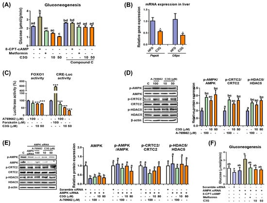 C3G activates AMPK and reduces gluconeogenesis through suppression of gluconeogenic gene expression. (A) Rate of gluconeogenesis in HepG2 cells incubated with C3G. 8-CPT-cAMP is a cAMP analogue. Metformin is an AMPK activator, while compound C is an AMPK inhibitor. (B) mRNA expression of gluconeogenic genes measured through qPCR. Transcription factor activity assay. (C) The activities of FoxO1 and CRE were measured using a luciferase assay. A769662 is an AMPK activator, and forskolin is an adenylate cyclase activator. (D) C3G stimulates AMPK, CRTC2 and HDAC phosphorylation in HepG2 cells. (E) AMPK, CRTC2 and HDAC5 phosphorylation in HepG2 cells with AMPKα1 gene knockdown. (F) Rate of gluconeogenesis in HepG2 cells following AMPKα1/α2 gene knockdown. For comparisons between two groups, Student’s t-test was performed. *, p < 0.05; ***, p < 0.005 compared with controls. For multiple-group comparisons, one-way ANOVA was performed. Different letters indicate statistically significant differences at p < 0.05.