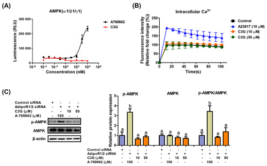 Mechanism through which C3G activates AMPK. (A) In vitro AMPK kinase assay. (B) Analysis of intracellular calcium in HepG2 cells stimulated with A23817 or C3G. (C) AMPK phosphorylation in cells following AdipoR1/2 gene knockdown. For multiple-group comparisons, one-way ANOVA was performed. Different letters indicate significant differences at p < 0.05.
