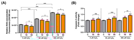 The measurement of caspase-3 activity was conducted with the colorimetric Caspase-3 Assay Kit (Sigma Aldrich, St. Louis, MO, USA) following the manufacturer’s protocol. HepG2 cells were seeded in 96-well plates (1 × 105 cells/well) and co-treated with H2O2 containing the tested compounds: 0.1% v/v DMSO (vehicle), 10 μM or 50 μM C3G for 24 h. Fluorescence was measured with a microplate reader at 340/440 nm excitation/emission wavelengths.