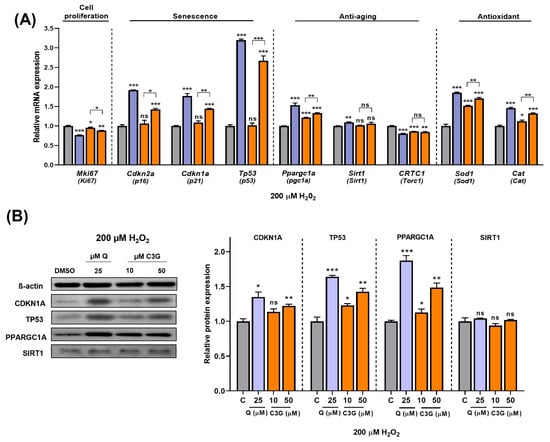 Effect of C3G in cell proliferation, senescence, anti-aging and antioxidant markers in HepG2 after H2O2-induced senescence. (A) RT-qPCR. (B) Immunoblotting. The results represent the mean ± SEM (n = 3). For comparisons between two groups, Student’s t-test was performed. *, p < 0.05; **, p < 0.01; ***, p < 0.005 compared with controls. C, control (0.1% DMSO); C3G, Cyanidin 3-glucoside; Q, quercetin; ns, not statistically significant.