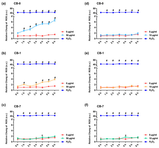 Determinations of intracellular ROS. Intracellular ROS production over time in J774A.1 cells upon CB particle treatment at 50 µg/mL (a–c) and 10 µg/mL (d–f) (n = 3). The untreated group was used as the negative control and 0.2% H2O2 was used as the positive control. All controls are untreated groups. Statistical significance between groups: (*) p < 0.05 and (#) p < 0.001, relative to the untreated control. Abbreviations: ROS, reactive oxygen species.