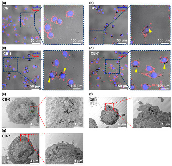 Given that the changes in surface physicochemical properties could influence the toxicity profiles of CB particles, we further conducted experiments to explain the potentially detrimental influence on macrophages through unraveling the interactions between particles and cells. The states of the CB particles and cellular morphologies were observed through confocal microscopy. A sublethal concentration of CB particles (i.e., 10 μg/mL) was used to avoid dramatic cell death. As shown in Figure 4a–d, significant aggregates of CB-0 particles could be recognized in the cytoplasm, indicating the high phagocytosis of CB-0 by J774A.1 cells. Moreover, CB-1 particles could also be found within the cells, but they appeared more scattered instead of large aggregates, corresponding to the change of Dh after ageing. Otherwise, different interaction patterns between particles and cells were observed for CB-7 treatments. Specifically, limited CB-7 particles were endocytosed by J774A.1 cells, and most of the particles were attached to the plasma membrane (Figure 4c). In the following, the interactions between cells and particles were zoomed in on through TEM observations. As shown in Figure 4e–g, the aggregations of CB-0 and CB-1 were recognized within J774A.1 cells, while CB-7 could only be found around the plasma membrane, in line with the results of confocal microscopy. To substantiate this result, an SDS-PAGE investigation was conducted to semi-quantify the endocytosis of the CB particles with the same number of cells (Supplementary Figure S3). The trends were in agreement with our observations from both confocal microscopy and TEM (Supplementary Figure S3). It should be noted that surface O-functional groups not only controlled the direct carbon-based nanomaterial aggregations in the biological medium, but more importantly, the nanomaterial–cell interaction represented a potentially predominant factor in controlling cytotoxicity [48]. When CB particles were highly oxidized, namely CB-7, the colloidal stability would increase (Figure 1d). However, the higher content of the carboxyl group (-COOH) on the surface appeared to transform CB particles into a likely “edge-to-edge” manner, as described previously [48,49]. The special form of aggregation morphology of CB-7 particles would inhibit the endocytosis of macrophages and then diminish the cytotoxicity effects, in agreement with the previous study [49].