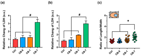 Cellular morphological changes by CB particles in macrophages. (a,b) The relative release of LDH from J774A.1 cells in response to CB particles at 5 µg/mL (a) and 10 µg/mL (b) for 24 h (n = 3). (c) Statistics of length to width ratio of J774A.1 macrophages after exposure to CB particles (10 µg/mL) at 24 h from confocal images, with a schematic diagram illustrating the statistical method of the ratio of length/width. All controls are untreated groups. Statistical significance between groups: (*) p < 0.05 and (#) p < 0.001, relative to the untreated control. Abbreviations: CB, carbon black; LDH, lactate dehydrogenase.