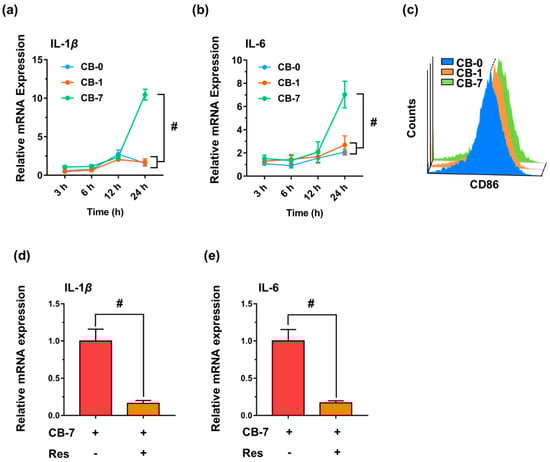 Inflammatory responses induced by CB particles in macrophages. (a,b) Gene expression levels of IL-1β and IL-6 in J774A.1 macrophages after exposure to CB particles at different time points (10 µg/mL, n = 6) relative to the untreated control. (c) CD86 expression level in J774A.1 macrophages after exposure to CB particles (10 µg/mL) for 24 h, as determined by flow cytometry analysis. (d,e) IL-1β and IL-6 expression levels in J774A.1 macrophages after exposure to CB particles for 24 h with or without pretreatment with the Res (at 1 μM, n = 6), as characterized by qRT-PCR analysis relative to the untreated CB-7 group. All controls are untreated groups. Statistical significance between groups: (#) p < 0.001. Abbreviations: CB, carbon black; IL, interleukin; Res, Resatorvid.