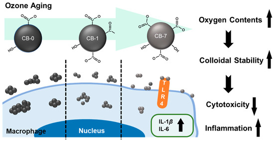 We reported the impact of the ageing process on the physicochemical changes of UFPs, and also the cytotoxicity profiles and the inflammatory reactions in macrophages. Airborne UFPs are subjected to various atmospheric conditions, such as air pollutants (e.g., SO2, O3, and NOx), light, and humidity, giving rise to remarkable alternations in surface O-functionalities. Under this premise, despite numerous toxicity studies on fine air particles, rather limited knowledge has been obtained to understand ageing-determined toxicity profiles. Airborne particles after inhalation can enter the lung deeply and then be endocytosed by macrophages. Our data unraveled that the species of surface O-containing groups essentially dictated the bioreactivity and cyto-compatibility of aged CB particles towards macrophages, and even the inflammatory reactions in macrophages. These findings, therefore, offer a new point of view in proving the risks of particulate pollution and the effects associated with the ageing process.
