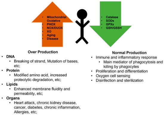 Oxidative stress (OS), defined as disturbance in the pro/antioxidant balance, is harmful to cells because it involves the excessive generation of highly reactive oxygen species (ROS) and reactive nitrogen species (RNS). Under normal physiological conditions, cells maintain redox homeostasis by generating and eliminating ROS/RNS. OS plays a role in physiological adaptation and signal transduction [1], including the regulation of cell survival, but if the redox balance is disrupted, the resulting severe increase in ROS/RNS leads to adverse changes to cell components. This, in turn, results in inflammatory neutrophil infiltration, increased secretion of proteases, and the production of a large number of oxidation intermediates, which are considered important factors in aging and disease [2]. As described in this review, scientists have found that OS is closely related to disease (kidney, nerves, brain) and inflammation [3,4,5]. Moreover since the outbreak of the Corona virus Disease 2019 (COVID-19), an increasing number of studies have focused on OS and COVID-19, including the associated tissue damage, pathogenesis and therapeutics [6,7,8].