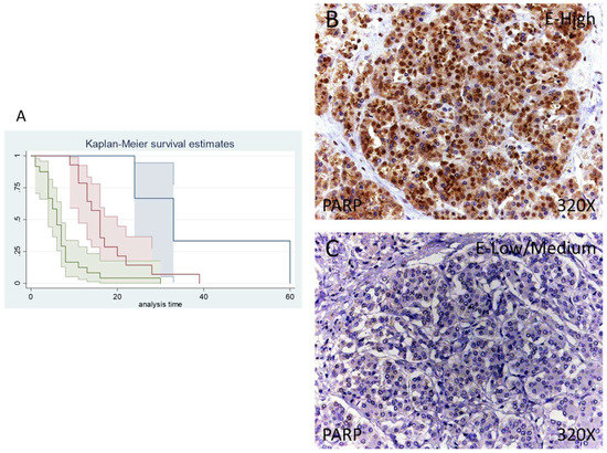 (A) Kaplan–Meier curves for survival time according to tumor expression of PARP. Blue curve = tissue expression classified as negative, red curve = tissue expression classified as low/medium, green curve = tissue expression classified as high. (B,C) Images showing the protein expression of PARP in patients diagnosed with pancreatic cancer.