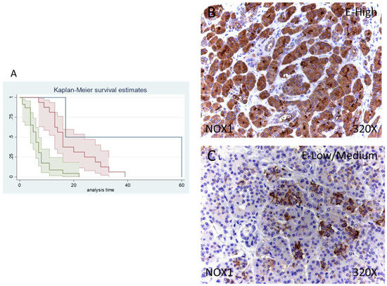 NOX1 and NOX2 are two critical markers also related to oxidative stress. Both enzymes are electron-transporting membrane proteins responsible for ROS generation, mainly superoxide anion (O2●−), and hydrogen peroxide (H2O2) [46]. Compelling evidence suggest that NOX1 and other NOX members are prominent players in the carcinogenesis and malignization of tumoral cells, with important actions for their survival and growth [22]. In addition, both NOX1 and NOX2 have important immunomodulatory functions, also being implicated in metastasis. Thus, there are some novel antitumoral therapies targeting these components, showing some promising but still early results [47,48,49]. In this study, we demonstrated that patients with a higher expression of NOX1 and NOX2 exhibit lower survival rates than those with mild or no expression. Recently, Lyu et al. [50] reported an augmented expression of NOX1 and NOX2 in pancreatic cancer tissues, although they failed to find any association between their expression and the patients’ survival. Further efforts are needed to clarify a possible association between NOX1 and NOX2 as prognostic biomarkers in pancreatic tumors.