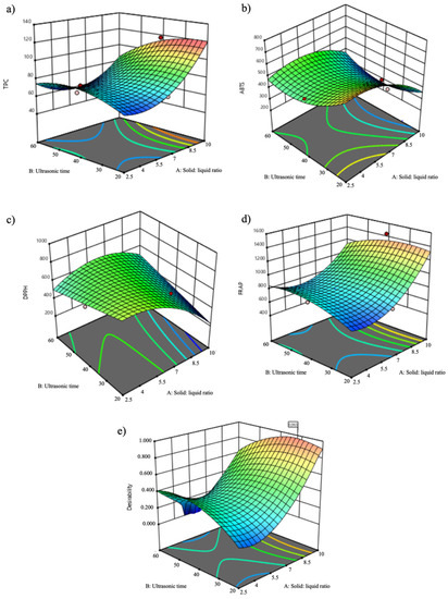 The relationship between the independent (solid: liquid ratio, time, and intensity) and the dependent (TPC, ABTS, DPPH and FRAP assays) variables was illustrated in tridimensional (3D) representation of the response surface contour plots generated by the model for the extraction of bioactive compounds from kiwiberry leaves at the fixed intensity of 30 W/m2 (Figure 1).