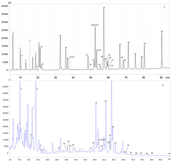 HPLC-PDA chromatogram monitored at 280 nm for (a) polyphenol standard mixture of 5 mg/L and (b) optimal extract from kiwiberry leaves; peak identification: (1) gallic acid, (2) protocatechuic acid, (3) neochlorogenic acid, (4) (+)-catechin, (5) caftaric acid, (6) caffeine, (7) chlorogenic acid, (8) 4-O-caffeyolquinic acid, (9) vanillic acid, (10) caffeic acid, (11) syringic acid, (12) (−)-epicatechin, (13) p-coumaric acid, (14) ferulic acid, (15) sinapic acid, (16) trans-polydatin, (17) naringin, (18) 3,5-di-caffeoylquinic acid, (19) quercetin-3-O-galactoside, (20) resveratrol, (21) quercetin-3-O-glucopyranoside, (22) rutin, (23) phloridzin, (24) ellagic acid, (25) 3,4-di-O-caffeoylquinic acid, (26) myricetin, (27) cinnamic acid, (28) quercitrin, (29) kaempferol-3-O-glucoside, (30) isorhamnetin-3-O-glucoside, (31) kaempferol-3-O-rutinoside, (32) isorhamnetin-3-O-rutinoside, (33) naringenin, (34) trans-epsilon viniferin, (35) quercetin, (36) phloretin, (37) tiliroside, (38) kaempferol, (39) apigenin and (40) chrysin.