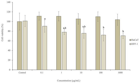 Effects of the optimal extract exposure on the viability of HaCaT and HFF-1 cell lines at different concentrations (0.1–1000 µg/mL), measured by the MTT assay (n = 3). Different letters (a, b) mean significant differences between the different tested concentrations (p < 0.05).