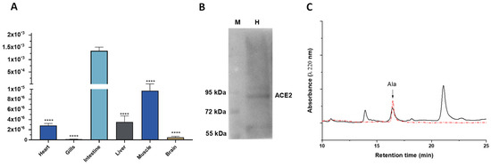 (A) ace2 mRNA expression levels in goldfish C. auratus tissues. The amounts of target mRNA are calculated as 2-ΔCt mean values obtained from the output Ct values of two rounds of real-time PCR assays for each of three independent biological replicates. Statistics were assessed by one-way ANOVA followed by a Sidak’s multiple comparison test (**** p < 0.0001); (B) Representative immunoblotting of ACE2 expression in the goldfish heart. M: marker; H: heart; (C) Representative HPLC chromatogram showing Alamandine (Ala) elution from C. auratus plasma compared to Alamandine standard (red dotted line).