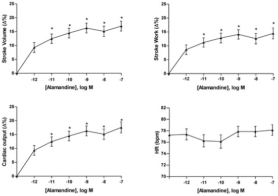 3.2. Effects of Alamandine on the Basal Cardiac Performance