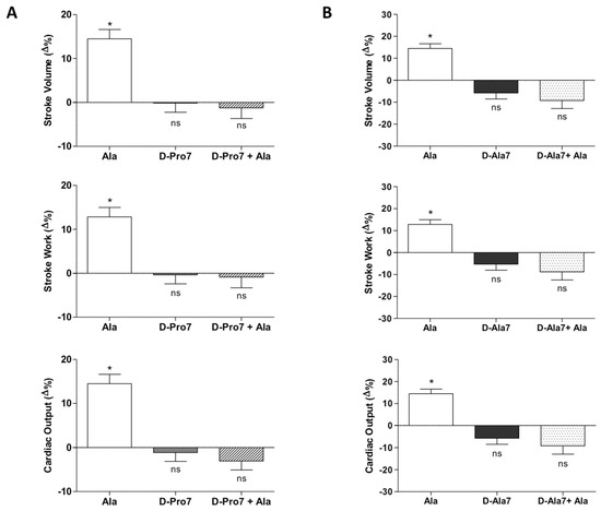 Effects of Alamandine (10−10 M) before and after treatment with D-Pro7 (10−12 M) (A) or D-Ala7 (10−12 M) (B) on SV, SW, and CO of the isolated and perfused goldfish heart. Percentage changes were evaluated as the mean ± s.e.m. of five experiments for each group. Statistical analysis was assessed by either repeated measures ANOVA followed by Dunnett’s post-test (* p < 0.05: Ala vs. control), or two-way ANOVA followed by Bonferroni post-test (ns = not-significant: D-Pro7 or D-Pro7 + Ala vs. control; D-Ala7 or D-Ala7 + Ala vs. control; D-Pro7 vs. D-Pro7 + Ala; D-Ala7 vs. D-Ala7 + Ala).