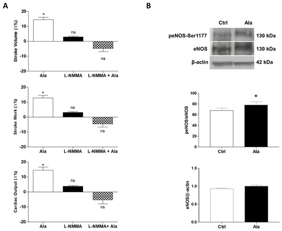 (A) Effects of Alamandine (10−10 M) before and after treatment with L-NMMA (10−5 M) on SV, SW, and CO of the isolated and perfused goldfish heart. Percentage changes were evaluated as the mean ± s.e.m. of seven experiments. Statistical analysis was assessed by repeated measures ANOVA followed by Dunnett’s post-test (* p < 0.05: Ala vs. control), or two-way ANOVA followed by Bonferroni post-test (ns = not-significant: L-NMMA or L-NMMA + Ala vs. control; L-NMMA vs. L-NMMA + Ala); (B) Representative immunoblot and densitometric analysis of eNOS/β-actin and peNOS/eNOS ratio in control hearts and in hearts treated with Alamandine (10−10 M). Data were expressed as means ± s.e.m. of absolute values from individual experiments (n = 4). Statistics were assessed by two-tailed unpaired t-test (* p < 0.05).