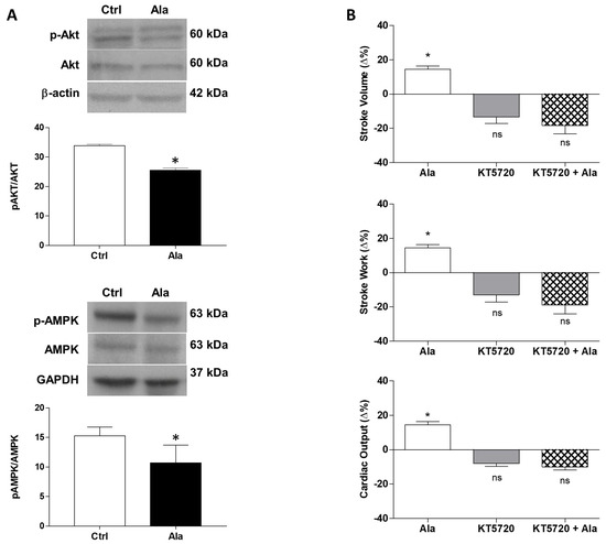 To further investigate the signaling pathways involved in the Alamandine-induced NOS activation, we assessed the phosphorylation of both protein kinase B (Akt), a key protein involved in NO production [30], and of AMP-activated protein kinase (AMPK), which is responsible for the Alamandine-dependent NO increase in rat cardiomyocytes [11]. In the isolated and perfused goldfish heart, Alamandine exposure reduced the phosphorylation of Akt on Ser473, and of AMPKα on Thr172 (Figure 5A). This prompted us to verify the role of the cAMP-dependent protein kinase, PKA, recognized as a modulator of NOS activity [31]. Pre-treatment with the PKA antagonist KT5720 (10−7 M) abolished the stimulatory effect induced by Alamandine on the cardiac parameters (SV, SW, and CO) of the goldfish heart (Figure 5B).