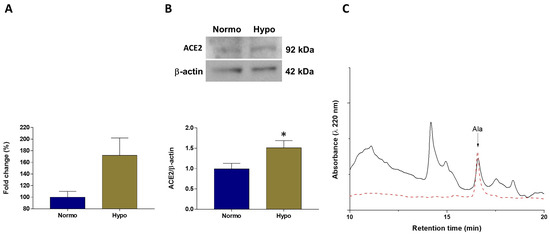 To evaluate whether exposure to hypoxia influences the ACE2/Alamandine axis, real-time PCR, Western Blotting, and HPLC analyses were performed on cardiac extracts and plasma of goldfish exposed to 4 days of hypoxia. Analysis of ace2 mRNA levels revealed an increasing trend in hypoxic vs. normoxic heart (~172% vs. 100%), although without statistical significance. However, comparative analyses of the blots showed a significant increase of ACE2 expression associated to hypoxia (Figure 6A,B). HPLC analysis also showed that, under hypoxia, plasma levels of Alamandine significantly increased by almost two-fold, reaching 59.6 ± 2.7 pmol/mL (mean ± s.e.m.) (Figure 6C).