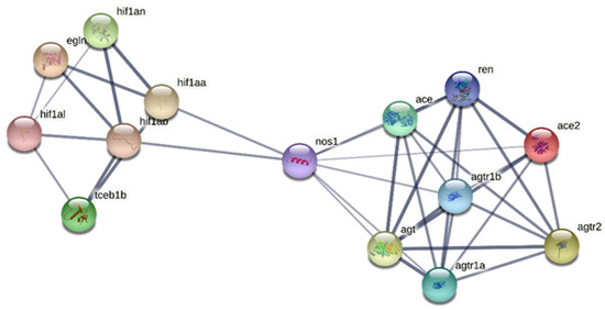 Analysis of the protein–protein interaction network (PPI) by the STRING online suite (version 11.5). The PPI network includes 14 proteins (number of nodes: 14; number of edges: 38; average node degree: 5.43; avg. local clustering coefficient: 0.623; expected number of edges: 2; PPI enrichment p-value: <1.0 × 10−16). ace2-related proteins: ace2, Angiotensin I converting enzyme 2; agtr2, Angiotensin II receptor, type 2; ace, Angiotensin I converting enzyme 1; agtr1a, Angiotensin II receptor, type 1a; agtr1b, Angiotensin II receptor, type 1b; ren, Renin; nos1, nitric oxide synthase; agt, Angiotensinogen; hif1-related proteins: egln1a, Egl-9 family hypoxia-inducible factor 1; hif1an, Hypoxia-inducible factor 1-alpha inhibitor; tceb1b, Transcription elongation factor B (SIII), polypeptide 1b; hif1al, Hypoxia-inducible factor 1, alpha subunit, -like; hif1ab, Hypoxia-inducible factor 1, alpha subunit b; hif1aa, Hypoxia-inducible factor 1, alpha subunit a.