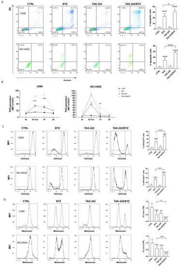 TLR4 inhibition increased BTZ cytotoxicity by promoting oxidative stress coupled with mitophagy. (A) Representative dot plots of the effect of TAK-242, BTZ, and TAK-242/BTZ treatment on the viability of U266 and NCI-H929 cells are shown. The graphs (right panels) show the mean values of the percentage of apoptotic cells after annexin V–FITC and PI staining. (B) Reactive oxygen species production during drug treatment was measured in MM cell lines by the oxidation of 2′,7′-dichlorofluorescein (DCF-DA) using flow cytometry. (C) Mitochondrial membrane potential was assessed by using DiOC2(3) staining. Representative histograms of a flow cytometry analysis are shown (left panels). (D) Flow cytometric analysis of mitochondrial mass 24 h post-treatment was determined by using MitoTracker Red fluorescence. Representative histograms (left panels) are shown. Data are expressed as mean MFI ± SEM of n ≥ 4 biological replicates; * p < 0.05; ** p < 0.01; *** p < 0.001, **** p < 0.0001.