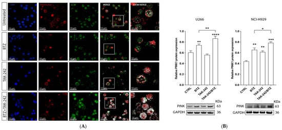 To evaluate how TLR4 signaling contributes to the acquisition of a BTZ resistant phenotype, we used the inhibitor TAK-242, which potently suppresses ligand-dependent and -independent TLR4 pathways by binding to the intracellular receptor domain. MM cell lines were pre-treated with 10 µM TAK-242 for 1 h before the addition of BTZ (15 nM). The combination of TAK-242 and BTZ significantly increased the cytotoxic effect of BTZ, as indicated by an increased number of apoptotic cells: 15.9 ± 1.2% and 27.9 ± 5.4% in TAK-242/BTZ-treated cells compared to BTZ-treated alone, respectively, in U266 and NCI-H929 cell lines (p < 0.05 and p < 0.0001, respectively; Figure 1A). Furthermore, we observed that pretreatment with the TLR4 inhibitor significantly increased the amount of BTZ-induced ROS. As shown in Figure 1B, the median fluorescent intensity (MFI) of H2-DCF increased from 20.3 ± 0.9 in BTZ treated cells to 79 ± 3.6 after 30 min (p < 0.0001) in U266 and from 25.4 ± 2.5 to 49.5 ± 14.5 after 1 h (p < 0.01) in NCI-H929. As high levels of ROS are associated with impaired mitochondrial function, we evaluated the effects of TAK-242/BTZ combination in comparison with BTZ treatment alone. Pre-treatment with TAK-242 increased the percentage of cells containing depolarized mitochondria of about 31.4 ± 7% and 19.5 ± 3.1%, respectively, in U266 and NCI-H929 cells (p < 0.0001 and p < 0.001, respectively; Figure 1C). This strong mitochondrial depolarization was accompanied by a decrease in mitochondrial mass (Figure 1D). Indeed, after TAK-242/BTZ treatment, MitoTracker-MFI value decreased by about 0.3 ± 0.19- and 0.4 ± 0.1-fold, respectively, in U266 and NCI-H929 cells compared to BTZ-treated ones (p < 0.05 and p < 0.001, respectively). Consistent with these data, we also observed an increased expression of in PINK1 (PTEN-induced kinase 1) after TAK-242/BTZ treatment compared to BTZ-treated cells (p < 0.01 in U266 and p < 0.05 in NCI-H929) (Figure 2). Notably, exposure of NCI-H929 to TAK-242 alone significantly increased PINK1 expression compared to control cells (p < 0.01), in agreement with the strong reduction of mitochondrial mass observed above in TAK-242-treated cells. As the reduction of mitochondrial mass associated with PINK1 overexpression was higher in MM cells treated with TAK-242/BTZ, we next evaluated if this drug combination activated mitophagy, a key process in the mitochondrial quality control aimed at the removal of dysfunctional mitochondria. We found that pre-treatment with TAK-242 strongly increased BTZ-induced mitophagy, as demonstrated by the colocalization of LC3 protein (a constituent of the autophagosome) with Mitotracker-stained mitochondria (Figure 2) (about 38-fold higher than BTZ-treated cells; p < 0.001).