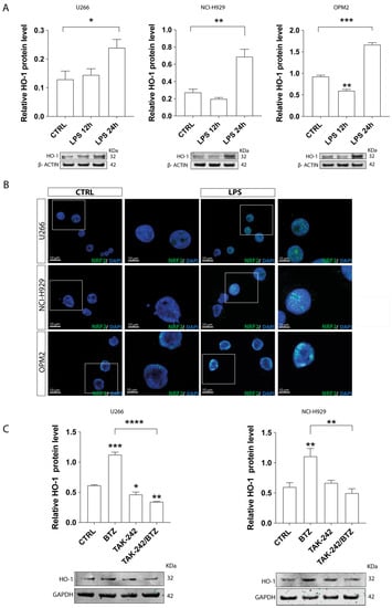 TLR4 modulated HO-1 expression. (A) Western blot analysis of HO-1 expression in myeloma cell lines after LPS treatment. β-actin protein was used as total protein loading reference. (B) Immunofluorescence of Nrf2 (green) nuclear translocation after LPS treatment in myeloma cell lines. (C) Western blot analysis of HO-1 expression in myeloma cell lines 24 h after drug treatments. GAPDH protein was used as total protein loading reference. For Western blot analysis, the optical density of the bands was measured using Scion Image software. Data are expressed as mean MFI ± SEM of n ≥ 4 biological replicates; * p < 0.05; ** p < 0.01; *** p < 0.001, **** p < 0.0001.