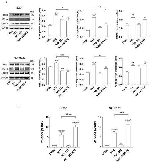 Given our findings, we then examined the impact of TAK-242/BTZ on HO-1 expression. As previously demonstrated by our group [18], BTZ treatment increased HO-1 expression in comparison with untreated cells (p < 0.001 in U266 cells and p < 0.01 in NCI-H929; Figure 3C). Notably, the pre-treatment with TAK-242 significantly decreased BTZ-induced HO-1 upregulation (p < 0.0001 and p < 0.01 compared to BTZ treated cells, respectively, in U266 and NCI-H929). Interestingly, TAK-242/BTZ treatment also decreased the overexpression of ER stress markers PERK (p < 0.05 and p < 0.001, respectively, in U266 and NCI-H929) and IRE1α (p < 0.05 in both cell lines) compared to cells treated with BTZ alone (Figure 4A). GRP78/BIP expression did not change between MM cells treated with BTZ or its combination with TAK-242. To better demonstrate that inhibition of BTZ-induced upregulation of ER transmembrane signaling markers (PERK and IRE1α) is linked to an increased apoptotic effect of BTZ by impairing the UPR survival pathway, we next evaluated the expression of CHOP, one of the UPR downstream effectors that promotes apoptosis. In both MM cell lines, TAK-242/BTZ cotreatment induced higher mRNA expression of CHOP (p < 0.001 compared to BTZ alone; Figure 4B).