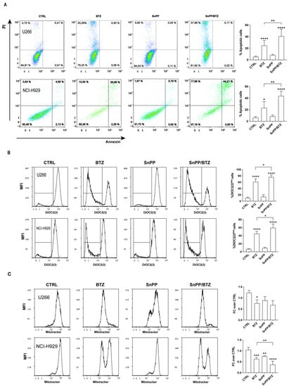 To evaluate if the combination of BTZ with SnPP affects mitochondrial function, we further assessed their effects on mitochondrial membrane potential. SnPP/BTZ treatment increased the percentage of depolarized cells to 14.1 ± 3.4% and 13.2 ± 3.4%, respectively, in U266 and NCI-H929 cells (p < 0.05 compared to BTZ alone; Figure 5B). SnPP alone did not have any effect on mitochondrial polarization. Concerning the mitochondrial mass content, we found that treatment with SnPP/BTZ decreased MitoTracker-MFI values only in NCI-H929 cells (p < 0.01 compared to BTZ alone; Figure 5C) but not in in U266 cells. In both cell lines, SnPP alone significantly decreased MitoTracker-MFI value compared to untreated cells.