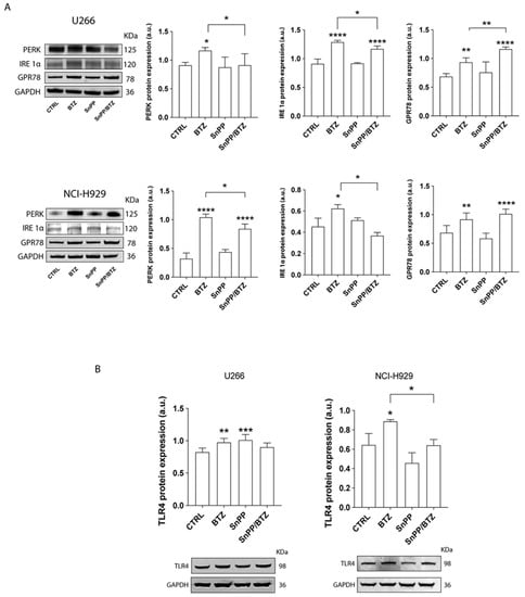 HO-1 enzymatic inhibition decreased BTZ-induced ER stress. (A,B) Analysis of expression of ER stress protein markers (PERK, IRE1α, GPR78) and TLR4 after SnPP treatment alone or in combination with BTZ. GAPDH protein was used as total protein loading reference. For analysis, the optical density of the bands was measured using Scion Image software. Data are expressed as mean MFI ± SEM of n ≥ 4 biological replicates; * p < 0.05; ** p < 0.01; *** p < 0.001; **** p < 0.0001.