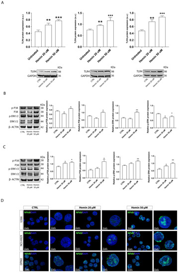 Hemin treatment increased TLR4 expression in myeloma cells. (A–C) Western blot analysis of TLR4 and MAP kinase P-38 and ERK1/2 expression after hemin treatment. GAPDH or β-actin proteins were used as total protein loading reference. For analysis, the optical density of the bands was measured using Scion Image software. (D) Immunofluorescence of Nrf2 (green) nuclear translocation after hemin treatment. Data are expressed as mean MFI ± SEM of n ≥ 4 biological replicates; * p < 0.05; ** p < 0.01; *** p < 0.001.