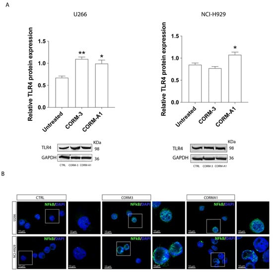 Carbon monoxide exposure induced TLR4 expression. (A) Western blot analysis of TLR4 expression after CORM-3 and CORM-A1 treatment in myeloma cells. GAPDH protein was used as total protein loading reference. For analysis, the optical density of the bands was measured using Scion Image software. (B) Immunofluorescence of Nrf2 (green) nuclear translocation after CORM-3 or CORM-A1 treatment. Data are expressed as mean MFI ± SEM of n ≥ 4 biological replicates; * p < 0.05; ** p < 0.01.