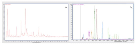 where B is the difference between the areas of the fortified sample and non-fortified one, and A is the area of the standard solution in the pure solvent. Thus, it was possible to evaluate if the matrix effect induced an ion suppression (values < 100%) or an ion enhancement (values > 100%). A ME value equal to 100% means that no matrix effect occurs; deals over 100% reveal a signal enhancement and matters less than 100% reveal a signal suppression [31].