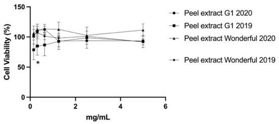 Cytotoxicity of the pomegranate peel extracts G1 and Wonderful 2019 and 2020 in HaCaT cells evaluated by MTT assay. For 24 h, cells were treated with an extract at different concentrations (0.15–5.00 mg/mL). The data are shown as a percentage of control cells and as the mean ± SEM of four separate experiments. (* p < 0.01 vs. untreated cells; one-way ANOVA with Dunnett post hoc test).