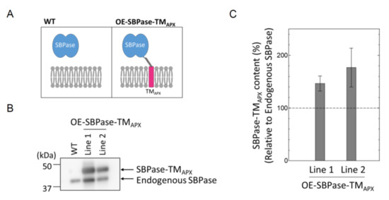 Generation of A. thaliana mutants expressing membrane-anchored SBPase. (A) Construction of SBPase-TMAPX. The blue ovals represent SBPase and the magenta cylinder represents TMAPX. The gray chain represents the Hexa-His-tag linker connecting SBPase to TMAPX. (B) SBPase-TMAPX expression in two independent lines was confirmed by Western blotting. (C) The relative expression level of SBPase-TMAPX in OE-SBPase-TMAPX plant was calculated from the signal intensities shown in (B). The expression level of endogenous SBPase in an OE-SBPase-TMAPX plant was defined to 100%. Each value represents the mean ± SD (n = 3).