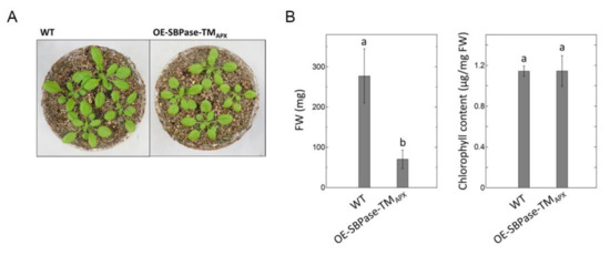 Phenotypes of mutant plants expressing membrane-anchored SBPase. (A) Four-week-old OE-SBPase-TMAPX plants. (B) Fresh weight (FW) and chlorophyll content of OE-SBPase-TMAPX plant. Each value represents the mean ± SD (n = 4). Different letters indicate significant differences among plant lines (p < 0.05; one-way ANOVA and Tukey’s honestly significant difference).