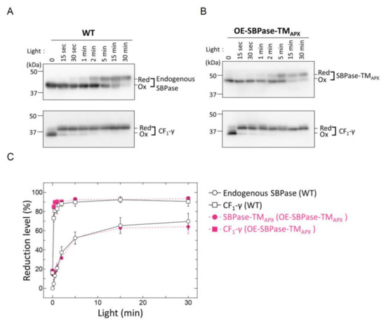 The reduction profiles in Figure 4 show a gradual reduction of both SBPase-TMAPX in OE-SBPase-TMAPX plants and endogenous SBPase in WT plants through light exposure time. In contrast, CF1-γ rapidly reached the maximum reduction level (about 90%) at approximately 120 s after light irradiation of OE-SBPase-TMAPX and WT plants. Thus, thylakoid membrane-bound and stroma-localized endogenous SBPases shared the same reduction kinetics, which was distinct from the rapid reduction response of CF1-γ.