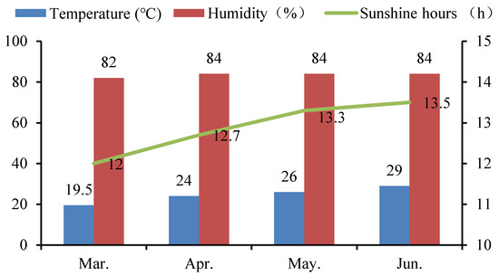 The average monthly temperature, humidity, and sunshine hours during the experiment period in 2019.