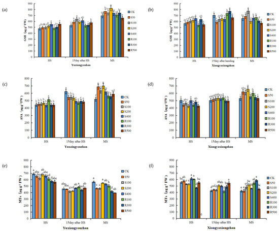 As the rice matured, the GSH content of the Yuxiangyouzhan leaves increased gradually. Compared with CK, the S200, S400, R300, and R500 treatments significantly increased the GSH content of the Yuxaingyouzhan leaves at the HS, while the S50, S100, S200, and S400 treatments significantly increased the GSH content at 15 days after HS and MS. In addition, R300 significantly increased the GSH content at MS, and R500 significantly increased the GSH content at 15 days after HS. For Xiangyaxiangzhan, S200 and S400 treatments increased the leaf GSH content at the HS; R300 and R500 significantly increased the leaf GSH content at 15 days after HS; and R100 significantly increased the leaf GSH content at the MS (Figure 2a,b). Compared with the HS, exogenous melatonin more obviously increased the ASA content at the MS. At the MS, the ASA content in the leaves of the two rice cultivars was promoted by the spraying and irrigation of melatonin at all concentrations. For Yuxiangyouzhan, the other treatments significantly increased the ASA content by 7.14–34.91% compared to the CK treatment. For Xiangyaxiangzhan, the ASA content increased by 17.23%, 15.39%, 24.06%, and 13.64% under S50, S100, S200, and R100 treatments, respectively (Figure 2c,d). For Yuxiangyouzhan, decreases in the MTs content in leaves were found under all treatments at the HS and MS. For Xiangyaxiangzhan, compared with CK, S400 and R100 treatments significantly increased the MTs content by 10.71% and 8.62%, respectively, at the HS; S200, S400, R300, and R500 significantly increased it by 18.72%, 17.12%, 14.66%, and 27.36% at 15 days after HS. At MS, all treatments increased the MTs content in the leaves, especially the S100, S200, R100, and R300 treatments, which remarkably increased the MTs content by 13.81%, 22.94%, 29.04%, and 38.94%, respectively (Figure 2e,f).