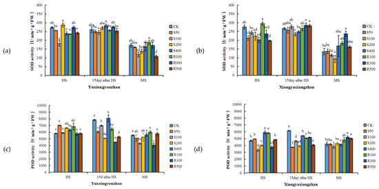 At the HS, 15 days after the HS and MS, fresh flag leaves were collected and stored at −80 °C till biochemical analyses were performed. The antioxidant enzymes’ activity and the content of malondialdehyde (MDA) and H2O2 were measured following the previously reported methods [35]. The fresh leaf sample (0.3 g) was homogenized with 3 mL of 100 mM PBS solution and centrifuged at 14,000× g and 4 °C for 15 min. The supernatant was used for measuring the activity of antioxidant enzymes (SOD, POD, and CAT) and the content of MDA and H2O2.