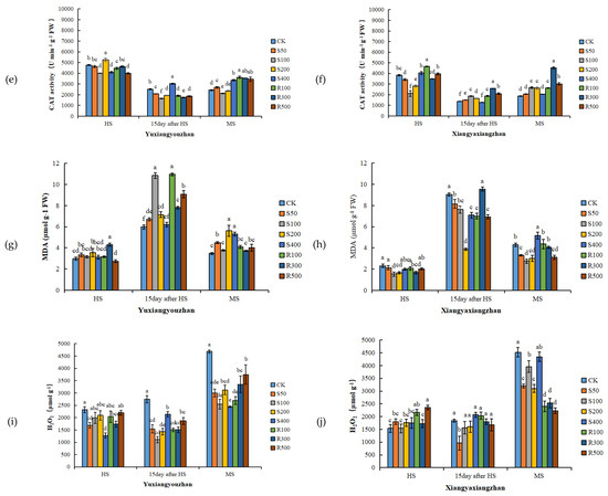 Effects of exogenous melatonin application on SOD activity in Yuxiangyouzhanand (a) and Xiangyaxiangzhan (b); POD activity in Yuxiangyouzhan (c) and Xiangyaxiangzhan (d); CAT activity in Yuxiangyouzhan (e) and Xiangyaxiangzhan (f); MDA content in Yuxiangyouzhan (g) and Xiangyaxiangzhan (h); and H2O2 content in Yuxiangyouzhan (i) and Xiangyaxiangzhan (j) at the heading stage (HS), 15 day after HS, and the MS. Means sharing similar letters indicate no significant difference at p < 0.05 according to the LSD test.