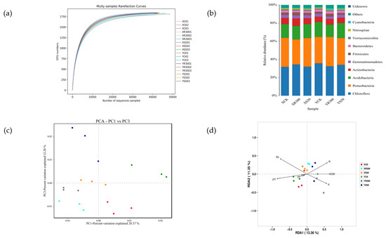 Rarefaction curve (a); histogram of species distribution (b); PCA plot of fungal communities in 18 soil samples under the XCK, XS50, YCK, YR300 treatments (c); RDA considering the fungal relative abundance at the operational taxonomic unit (OTU) level; SOM, soil total N, P, and K contents, Cd and Pb concentrations, and pH (d). XCK: Xiangyaxiangzhan growing under Cd–Pb stress without melatonin treatment; XR300: Xiangyaxiangzhan growing under Cd–Pb stress and irrigated with 300 μmol L−1 exogenous melatonin; XS50: Xiangyaxiangzhan growing under Cd–Pb stress and sprayed with 50 μmol L−1 exogenous melatonin; YCK: Yuxiangyouzhan growing under Cd–Pb stress without melatonin treatment; YR300: Yuxiangyouzhan growing under Cd–Pb stress and irrigated with 300 μmol L−1 exogenous melatonin; YS50: Yuxiangyouzhan growing under Cd–Pb stress and sprayed with 50 μmol L−1 exogenous melatonin.