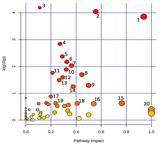 Overview of the enriched KEGG pathways. 1: Alanine, aspartate, and glutamate metabolism; 2: Arginine biosynthesis; 3: Aminoacyl-tRNA biosynthesis; 4: Nicotinate and nicotinamide metabolism; 5: Phenylpropanoid biosynthesis; 6: Citrate cycle (TCA cycle); 7: Butanoate metabolism; 8: Arginine and proline metabolism; 9: C5-Branched dibasic acid metabolism; 10: Valine, leucine, and isoleucine biosynthesis; 11: Pantothenate and CoA biosynthesis; 12: Glyoxylate and dicarboxylate metabolism; 13: Carbon fixation in photosynthetic organisms; 14: Pyrimidine metabolism; 15: Isoquinoline alkaloid biosynthesis; 16: Starch and sucrose metabolism; 17: beta-Alanine metabolism; 18: Glycine, serine, and threonine metabolism; 19: Vitamin B6 metabolism; 20: Betalain biosynthesis.