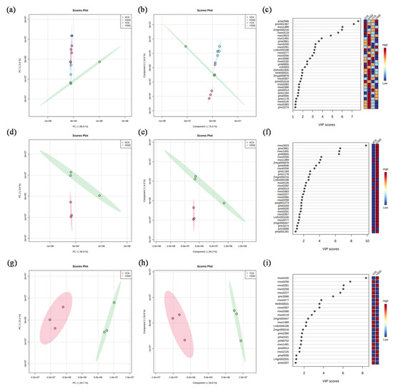 Multivariate pattern recognition analysis of metabolomics. (a) PCA plot of metabolites under XCK, XS50, YCK, and YS50 treatments; (b) PLS-DA plot of metabolites under XCK, XS50, YCK, and YS50 treatments; (c) VIP score of metabolites under XCK, XS50, YCK, and YS50 treatments; (d) PCA plot of metabolites under XCK and XS50 treatments; (e) PLS-DA plot of metabolites under XCK and XS50 treatments; (f) VIP score of metabolites under XCK and XS50 treatments; (g) PCA plot of metabolites under YCK and YS50 treatments; (h) PLS-DA plot of metabolites under YCK and YS50 treatments; and (i) VIP score of metabolites under YCK and YS50 treatments.