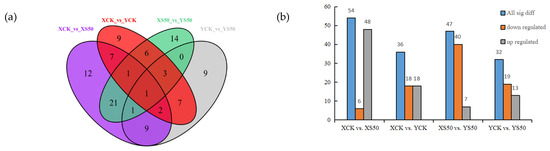 (a) Venn diagram showing the numbers of differential metabolites in XCK vs. XS50, XCK vs. YCK, XS50 vs. YS50, and YCK vs. YS50 comparisons. (b) Significant differential metabolites in XCK vs. XS50, XCK vs. YCK, XS50 vs. YS50, and YCK vs. YS50.