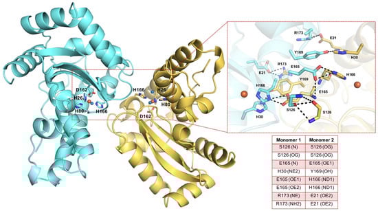 Both cambialistic SODs adopt the topology of Fe/Mn–SODs, consisting of a symmetric dimer formed by two identical monomers. The strictly conserved active site of Mn–SODs in SmSOD structure lies on the interface between these two monomers and comprises three histidine residues (H26, H80 and H166), one aspartic acid (D162) and a water molecule that coordinates the metal ion in a trigonal–bipyramidal geometry (Figure 1). A peculiar feature of the SmSOD structure is the presence, in one monomer, of an additional water molecule functioning as a sixth ligand and changing the metal coordination geometry to a distorted octahedron. Moreover, the catalytic activity of SOD enzymes heavily relies on their quaternary structure, and the dissociation of dimers into monomers results in the loss of enzymatic activity [13]. In the case of SmSOD, the dimer interface is stabilized by a number of hydrophobic and polar interactions, these latter detailed in the zoom-in of Figure 1. Given the binary symmetry of the SmSOD dimer, the interactions between the two chains are perfectly symmetric.