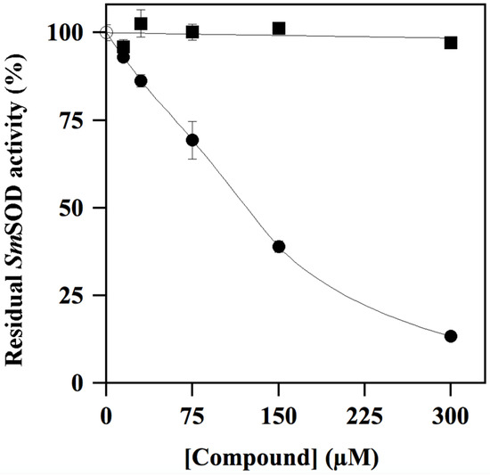 To get an insight on this effect, inhibition profiles up to 300 µM were realised for two compounds, namely the putative inhibitor ALS-31 and an apparently ineffective molecule, such as ALS-19. The results of a representative experiment (Figure 3) clearly indicate that only ALS-31 caused an evident dose-dependent inhibition of SmSOD activity. The calculated value of the ALS-31 concentration, leading to 50% inhibition of SmSOD activity (IC50), was 159 ± 19 µM.