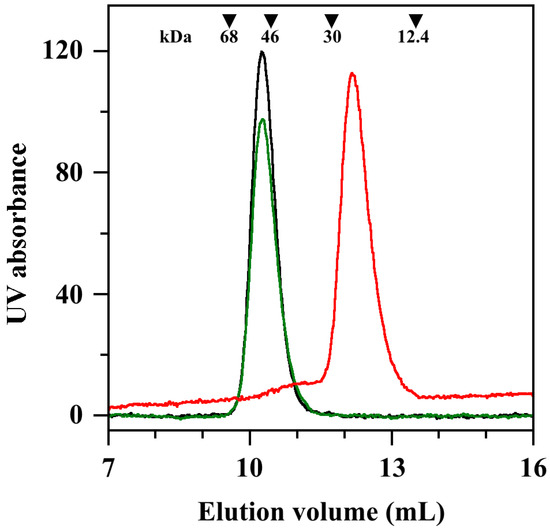 The conserved catalytic mechanism displayed by all SODs involves the sequential reduction and re-oxidation of the metal cation, with the concomitant oxidation and reduction of two superoxide anions. For this reason, the minimum requirement for triggering the enzymatic activity of SODs has been linked to the formation of the active form of the enzyme obtained through the assemblage of two monomers into a homodimer [18]. Indeed, SmSOD is also organised as a homodimer [11]. As a possible mechanism for the inhibition properties exhibited by ALS-31, the disassemblage of the SmSOD homodimer in the presence of the inhibitor was considered. To verify this hypothesis, a size exclusion chromatography was realised on a Superdex 75 10/300 column. The position of the single peak emerging from the elution profile of an untreated SmSOD sample (Figure 4, black line) confirms that this enzyme is organised as a homodimer, because the calculated molecular mass of 51.8 kDa was close to the theoretical Mr 46.9 assigned to homodimer. The small discrepancy between experimental and theoretical value of molecular mass was already observed for both SmSOD and StSOD [11,12] and was tentatively explained by the reversible formation of protein aggregates containing multiple homodimers at higher protein concentration. An almost identical elution was observed when the SmSOD sample was previously incubated with 200 µM ALS-31 before its loading (Figure 4, green line). On the other hand, if the equilibration and elution buffer of the column was enriched with 200 µM ALS-31, the position of SmSOD in the elution pattern was profoundly modified (Figure 4, red line). Indeed, the major protein peak shifted towards higher elution volume, thus resulting in a calculated molecular mass of 23.2 kDa, a value essentially coincident with the predicted Mr 23.4 assigned to the SmSOD monomer. This finding suggests that ALS-31 provokes the dissociation of the SmSOD homodimer in two monomers, a finding that compromises the catalytic activity of the enzyme. However, it is likely that the interaction between the enzyme and the inhibitor was reversible, because the dissociation into monomers was not observed when the inhibitor was absent in the eluting buffer. Interestingly, if ALS-31 was replaced by an inactive compound, such as ALS-9, present at 200 µM in both protein sample and elution buffer, the SmSOD eluted as a homodimer (not shown), thus indicating that this inactive compound did not affect the quaternary structure of the enzyme.