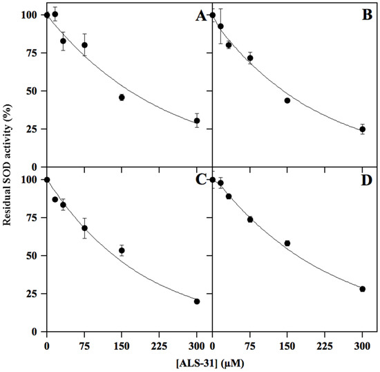 Representative effect of ALS-31 on the activity of different SODs. The activity of StSOD (A), Fe-SOD from Escherichia coli (B), Mn–SOD from rat mitochondria (C) or Cu/ZnSOD from bovine erythrocytes (D) was measured and expressed (●) as indicated in Figure 3.